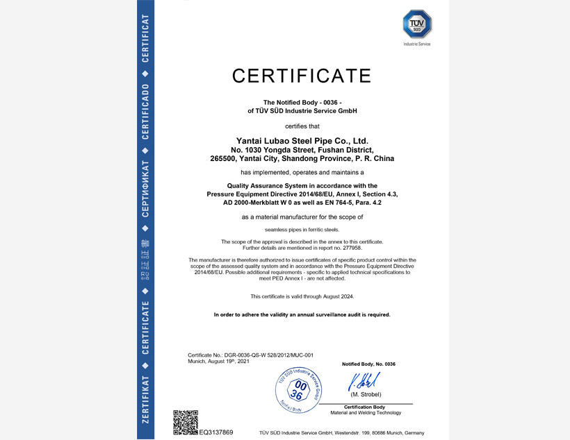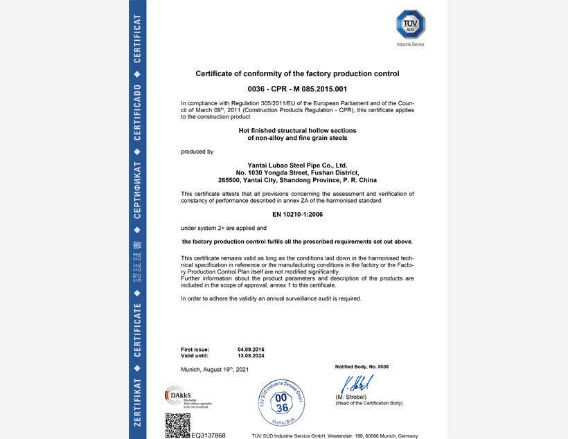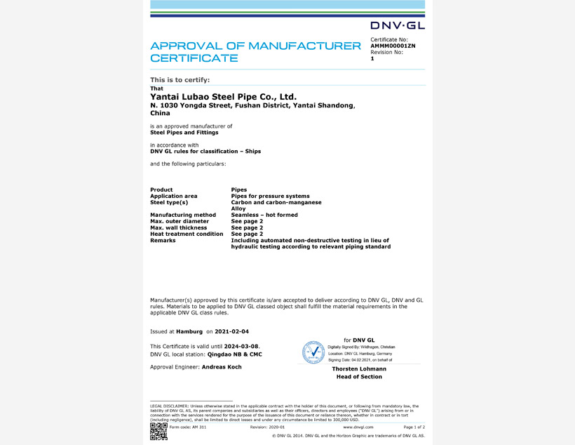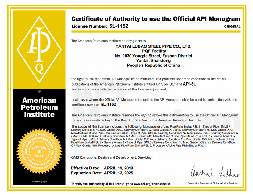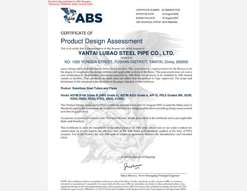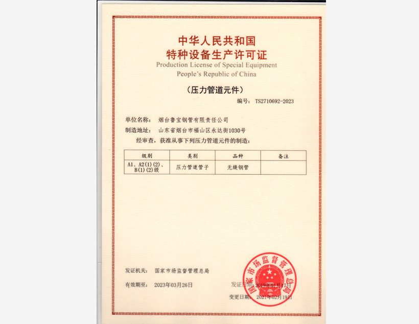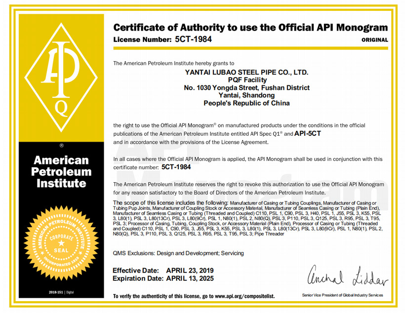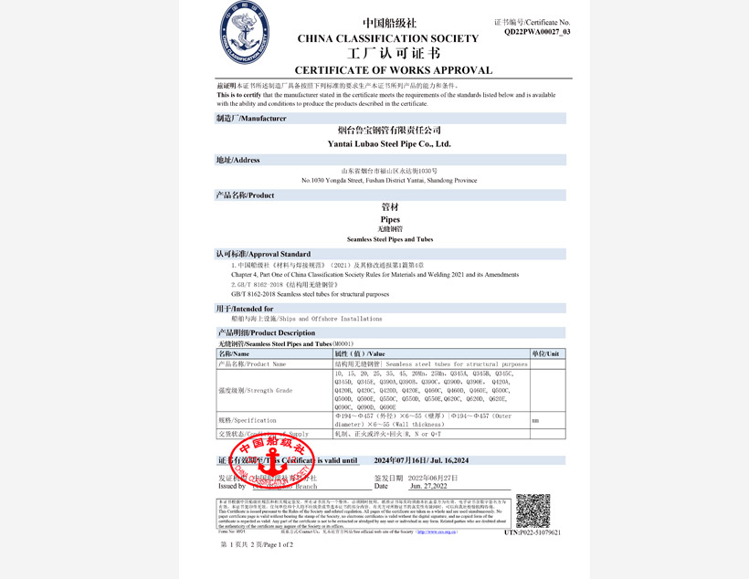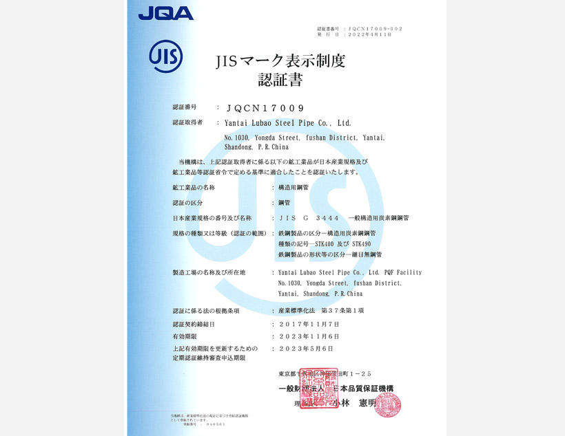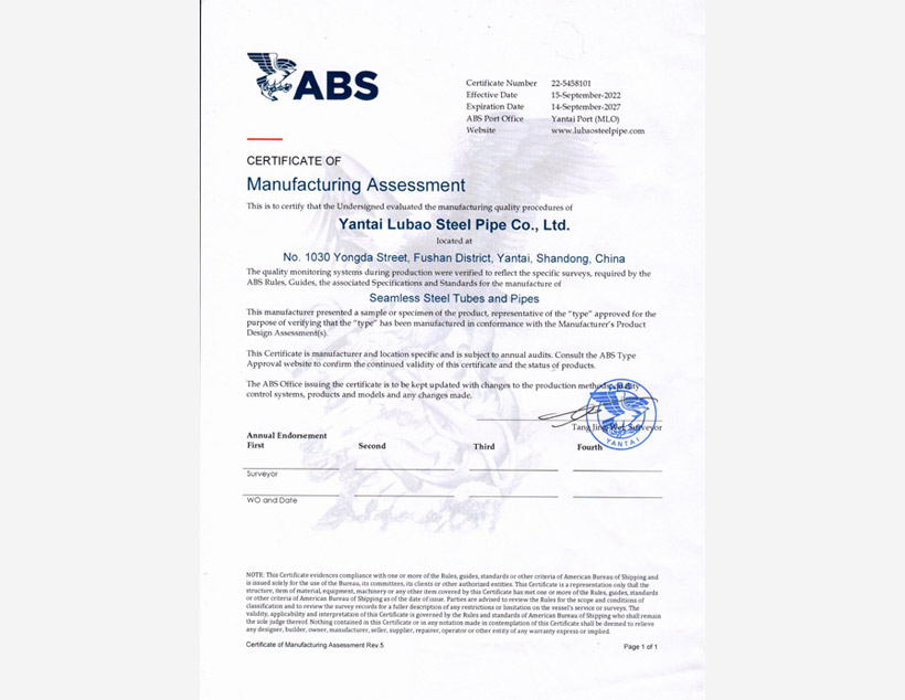 美國(guó)石油協(xié)會(huì)API 5CT認(rèn)證????|????美國(guó)石油協(xié)會(huì)API 5L認(rèn)證????|????TS(特種設(shè)備生產(chǎn)許可)????|????ABS PDA(美國(guó)船級(jí)社設(shè)計(jì)評(píng)估)認(rèn)證????|????ABS MA(美國(guó)船級(jí)社工廠評(píng)估)認(rèn)證????|????DNV(挪威船級(jí)社)認(rèn)證 ????|???? CCS(中國(guó)船級(jí)社)工廠認(rèn)可????|????? LR(勞氏船級(jí)社)認(rèn)證????|????? PED(歐盟承壓設(shè)備指令)認(rèn)證????|??? CPR(歐盟建筑用材料指令)認(rèn)證????| JIS(日本工業(yè)標(biāo)準(zhǔn))認(rèn)證