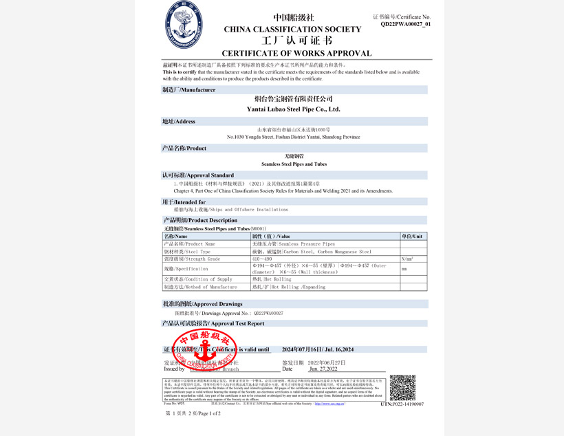 中國(guó)船級(jí)社CCS無(wú)縫壓力管認(rèn)可證書